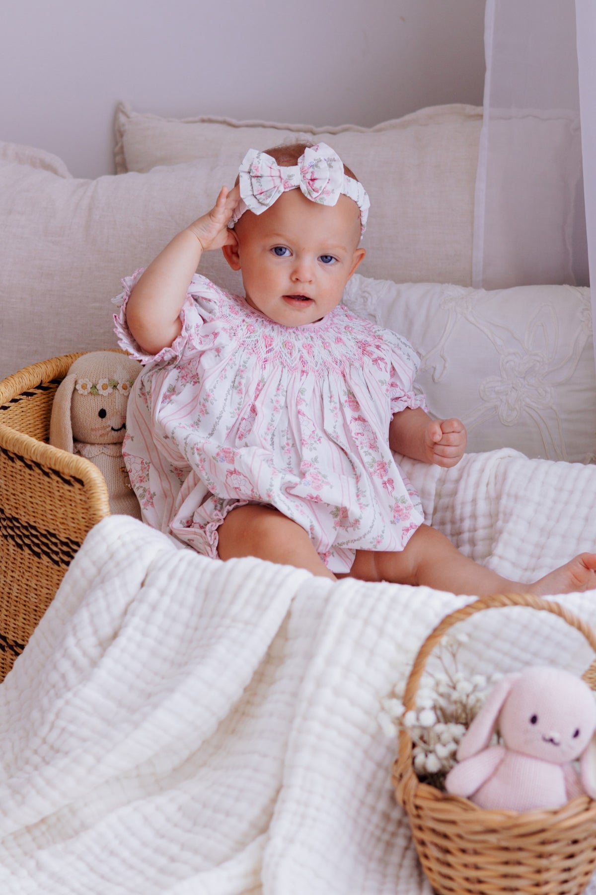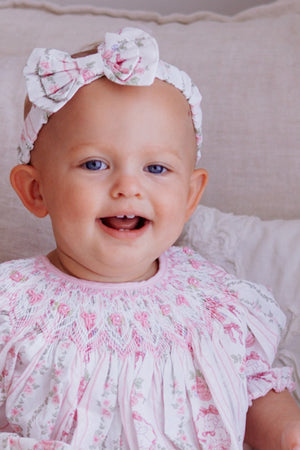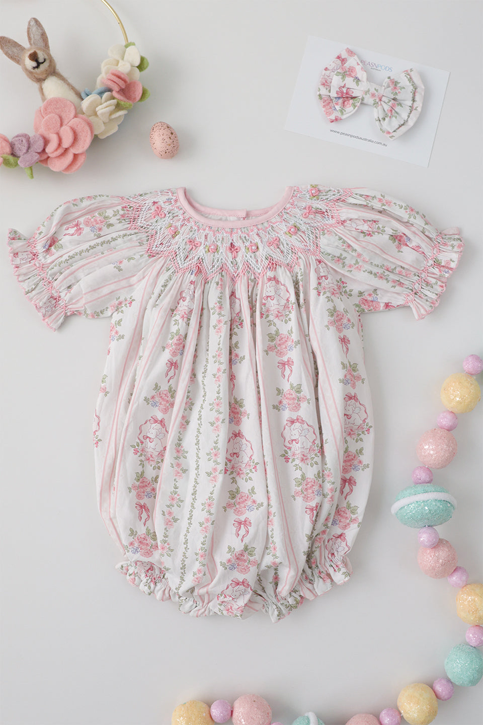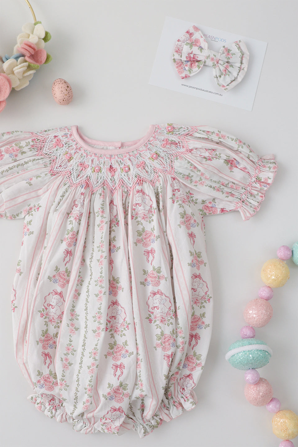 Featuring a delicate bunny and soft pink floral print in gentle vertical stripes, this classic bishop romper is beautifully handsmocked around the neckline with intricate bow and floral detailing. Soft puff sleeves and a relaxed, bubble silhouette create a timeless, traditional look that falls gracefully from the smocked neckline.