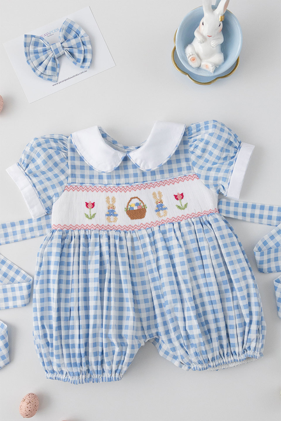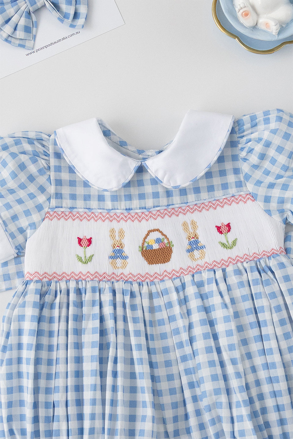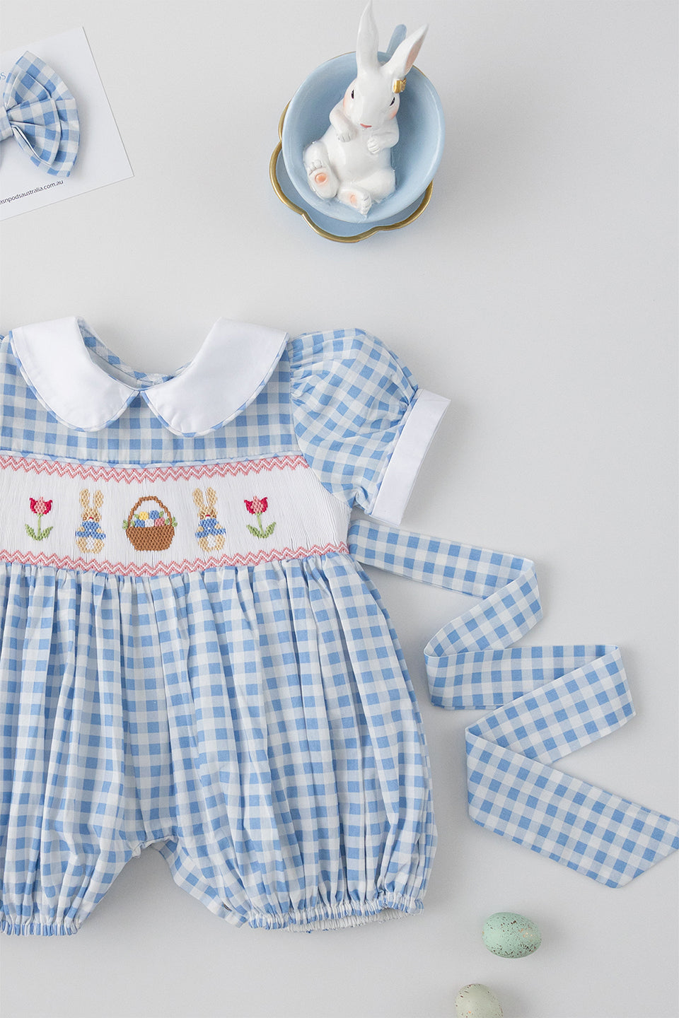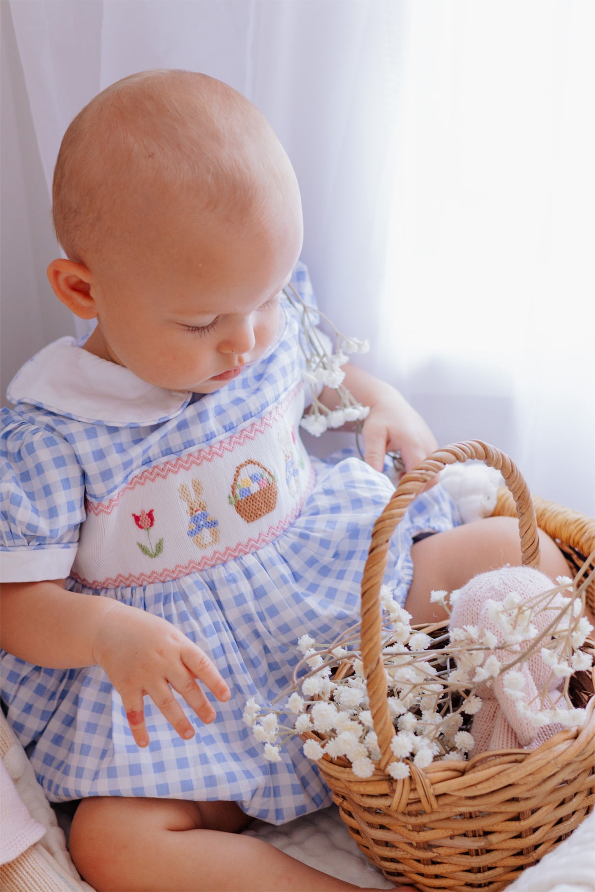 The Poppy Romper features a classic Peter Pan collar finished with fine piping. The bodice is hand-smocked in a white smock palette with embroidered floral details, including delicate roses in pink and yellow. The dress is crafted in a playful gingham print combining pink, yellow, and blue. It includes a back closure with mother-of-pearl buttons and is fully lined to ensure a comfortable fit. A timeless piece designed for little ones, perfect for special occasions or everyday wear.