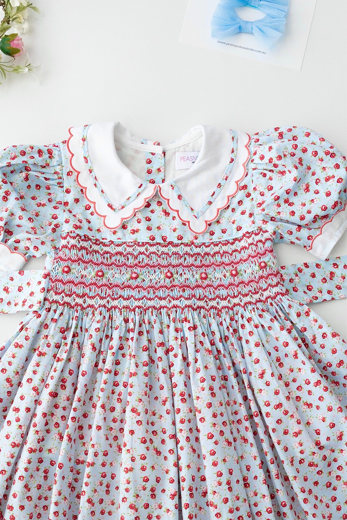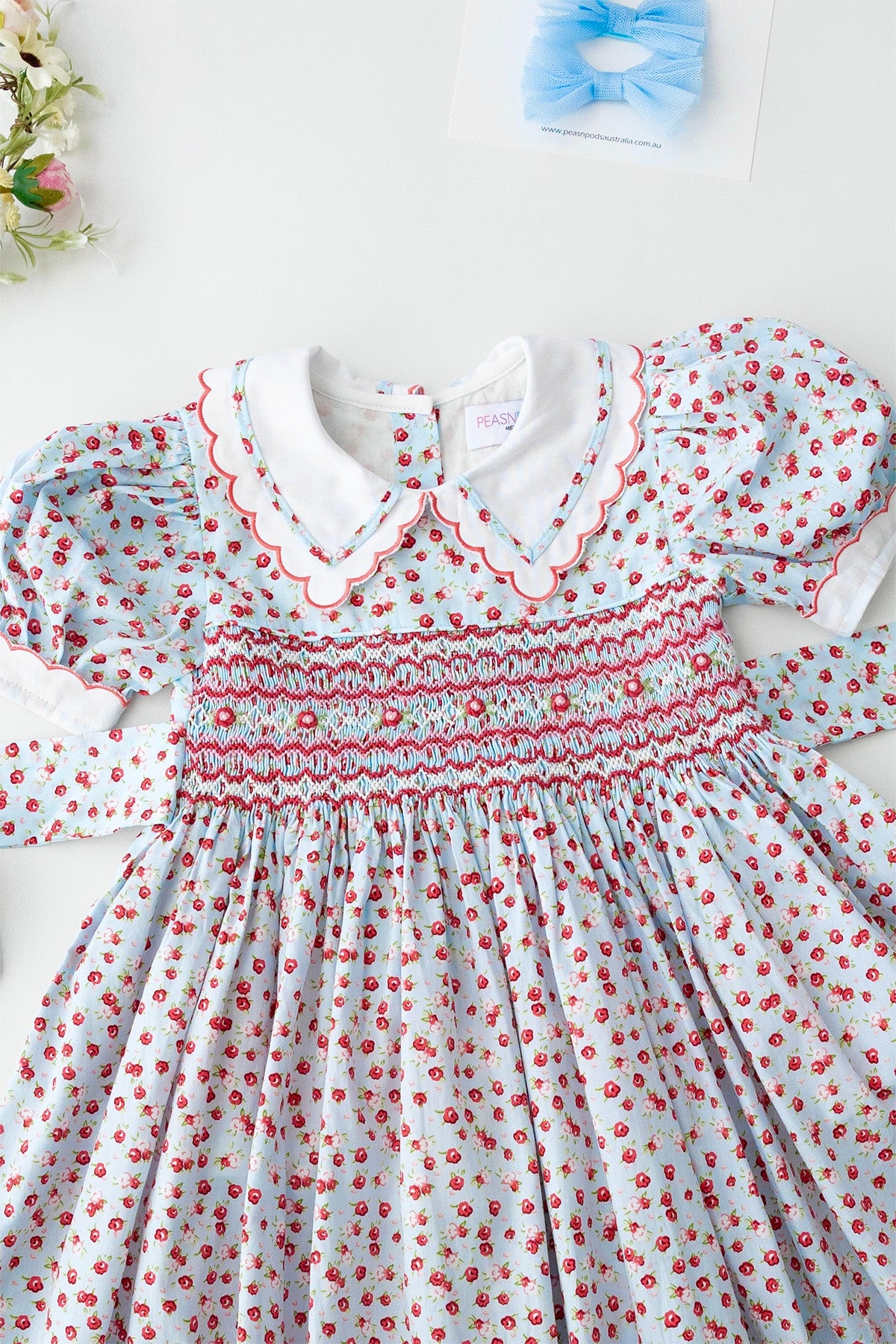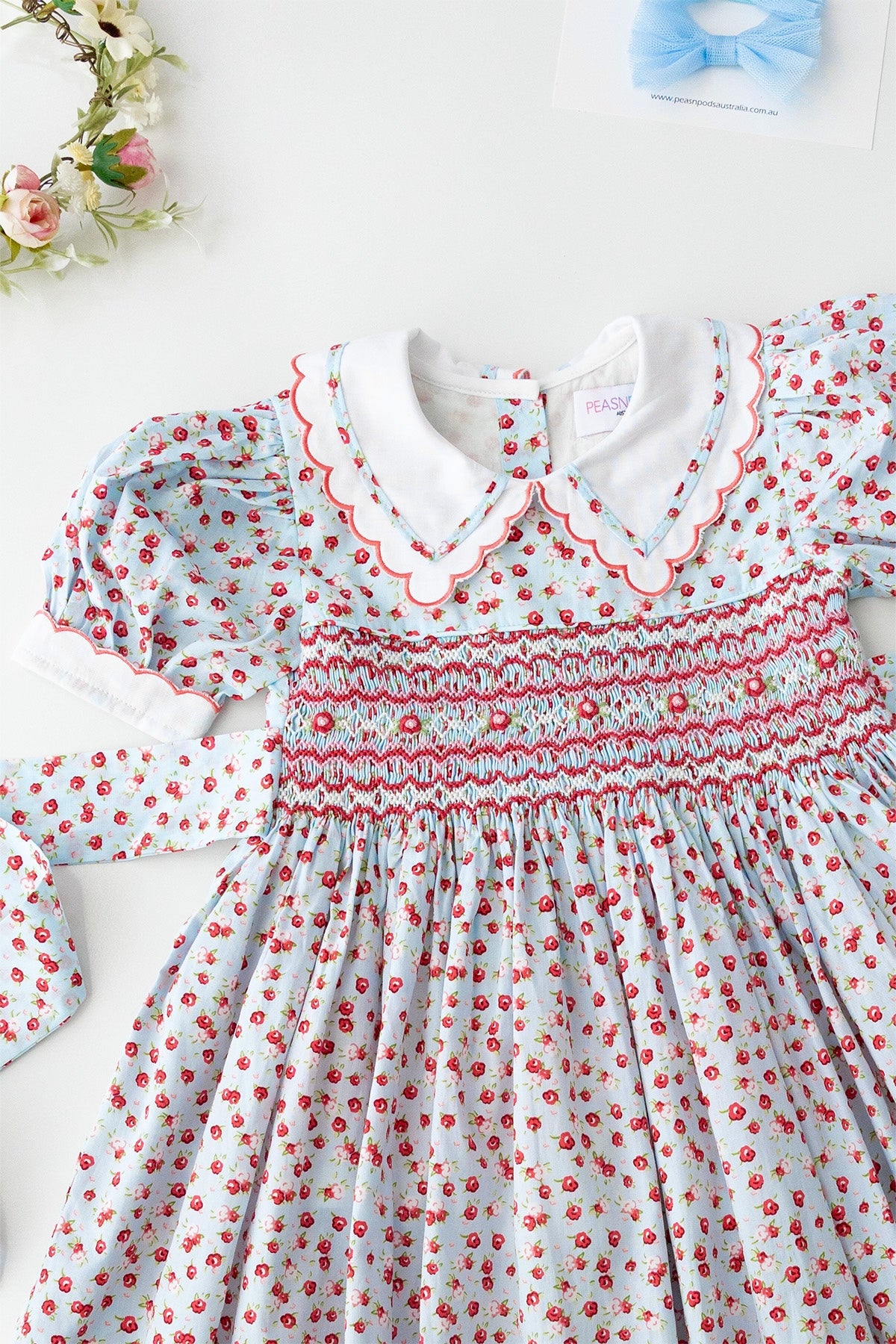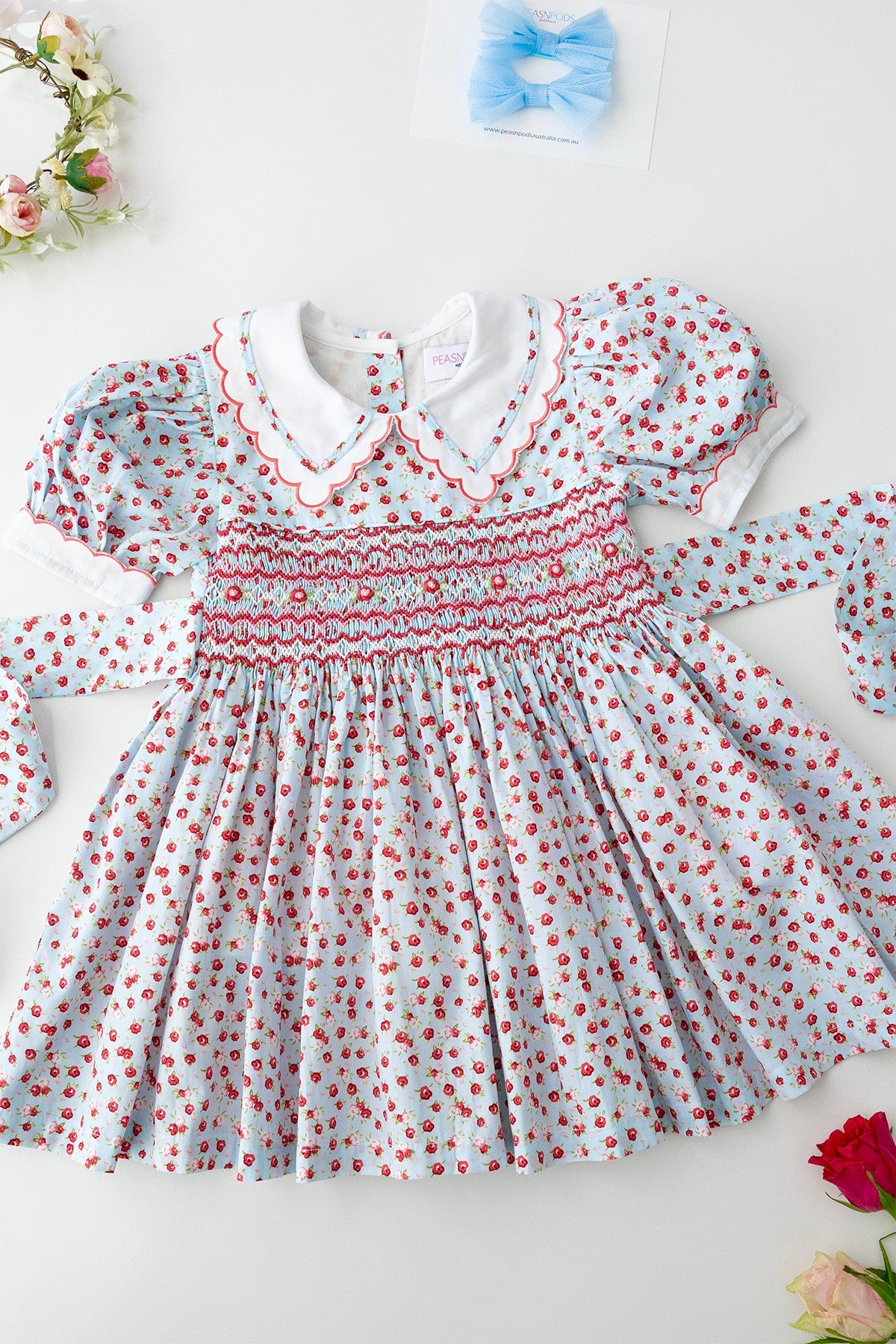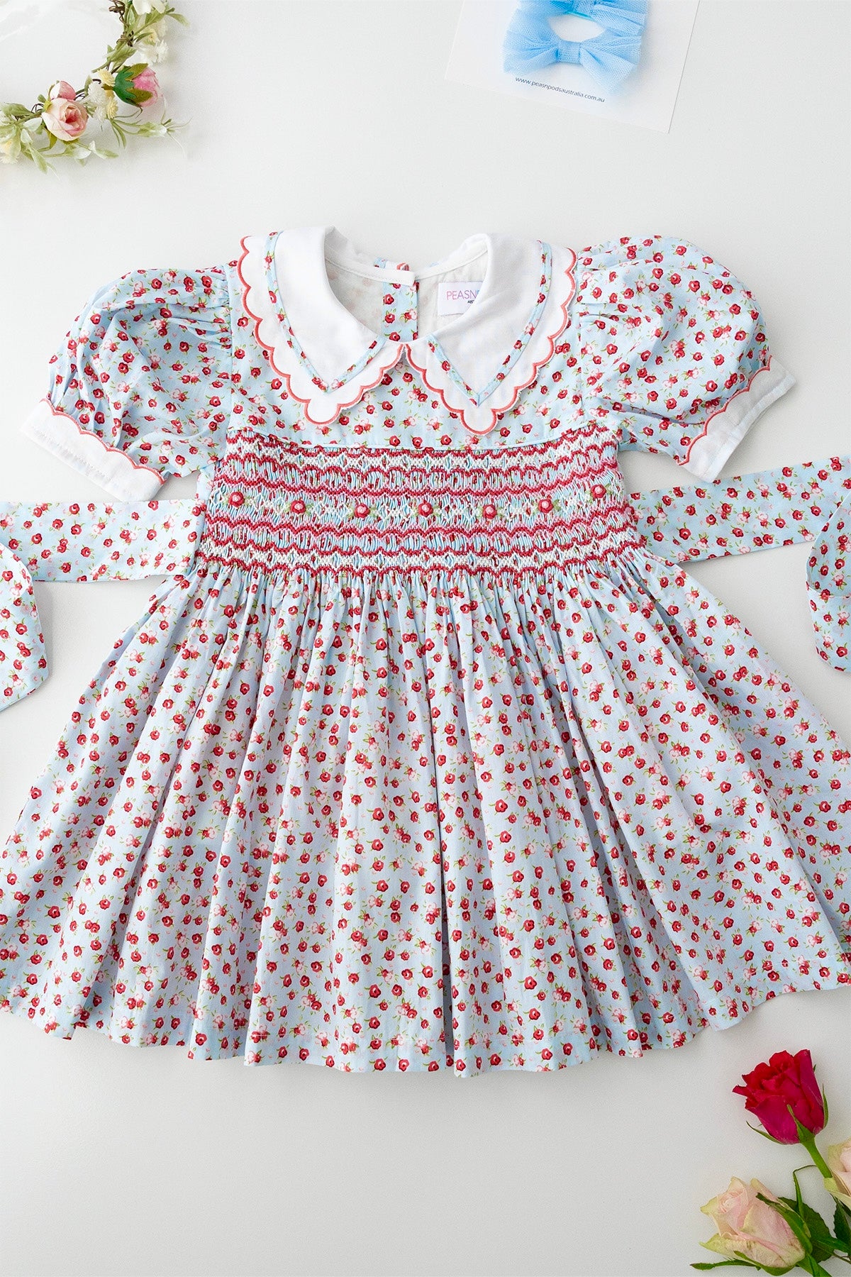 فستان كلارا روز المطرز يدويًا يتميز بياقة بيتر بان بيضاء ناصعة مع تطريز دقيق على شكل صدفة وحواف، بالإضافة إلى أكمام بيضاء متناسقة بنفس اللمسة النهائية. صُنع الجزء العلوي يدويًا بتطريز رائع بألوان الأحمر والوردي والأبيض، مع تطريز وريدات وتفاصيل أوراق خضراء ناعمة. يُربط حزام من الخلف على شكل فيونكة أنيقة لملاءمة مثالية. هذا الفستان، المبطن بالكامل بالقطن الناعم لراحة تدوم طوال اليوم، مثالي للاحتفالات والمناسبات الخاصة.