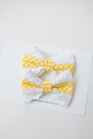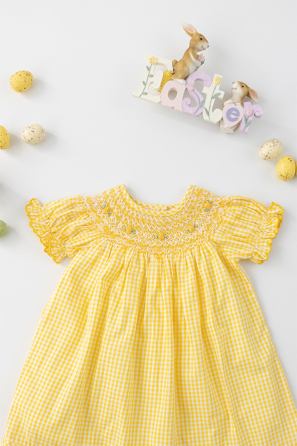 Our Yellow Gingham Bishop Dress featuring a cheerful yellow gingham fabric, this classic bishop silhouette is beautifully handsmocked around the neckline with delicate geometric smocking and sweet rose embroidery.