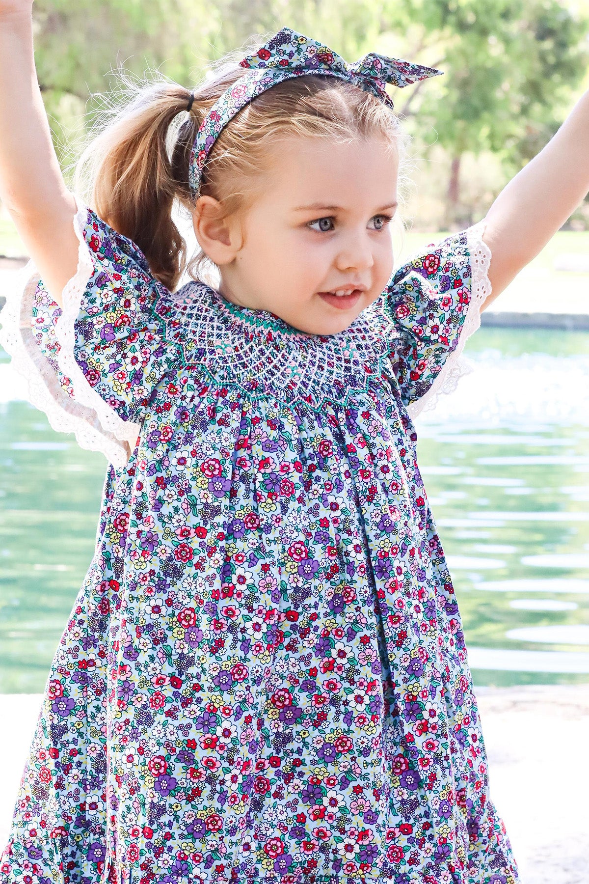 Blossom's Bishop Dress is a delightful celebration of colour and craftsmanship. Featuring a playful floral print, this dress brings together vibrant hues with a fully hand smocked neckline that adds an elegant, handcrafted touch. Delicate cotton trim on the flutter sleeves and a full frill along the hem lend a charming finish, while the soft cotton lining ensures comfort.