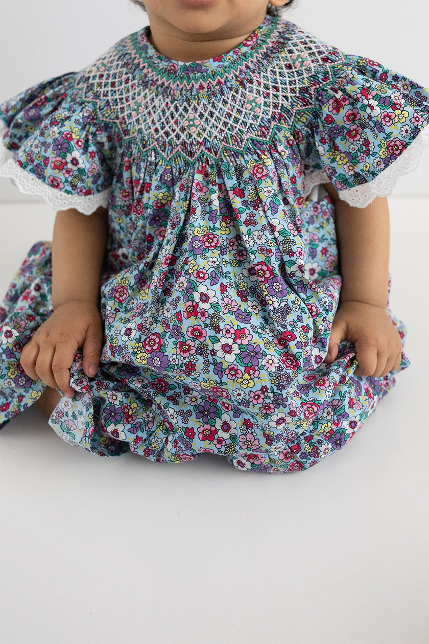 Blossom's Bishop Romper is a delightful celebration of colour and craftsmanship. Featuring a playful floral print, this Romper brings together vibrant hues with a fully hand smocked neckline that adds an elegant, handcrafted touch. Delicate cotton trim on the flutter sleeves and a full frill along the hem lend a charming finish, while the soft cotton lining ensures comfort.