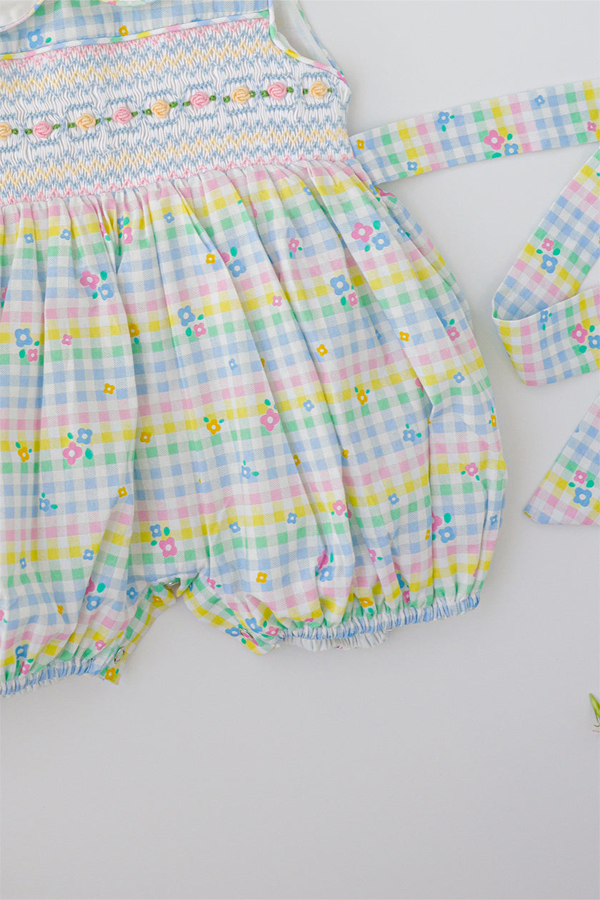 The Poppy Romper features a classic Peter Pan collar finished with fine piping. The bodice is hand-smocked in a white smock palette with embroidered floral details, including delicate roses in pink and yellow. The dress is crafted in a playful gingham print combining pink, yellow, and blue. It includes a back closure with mother-of-pearl buttons and is fully lined to ensure a comfortable fit. A timeless piece designed for little ones, perfect for special occasions or everyday wear.