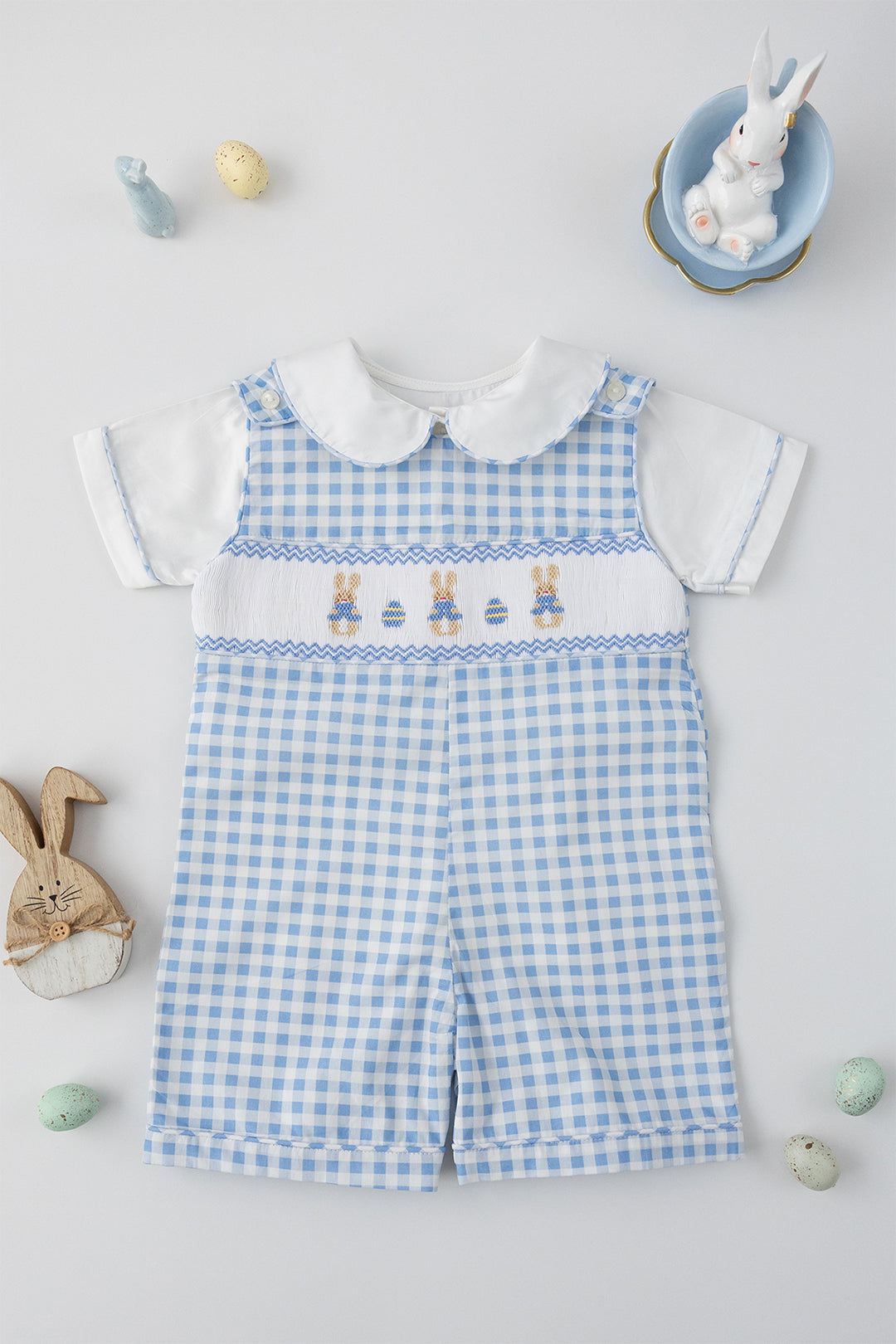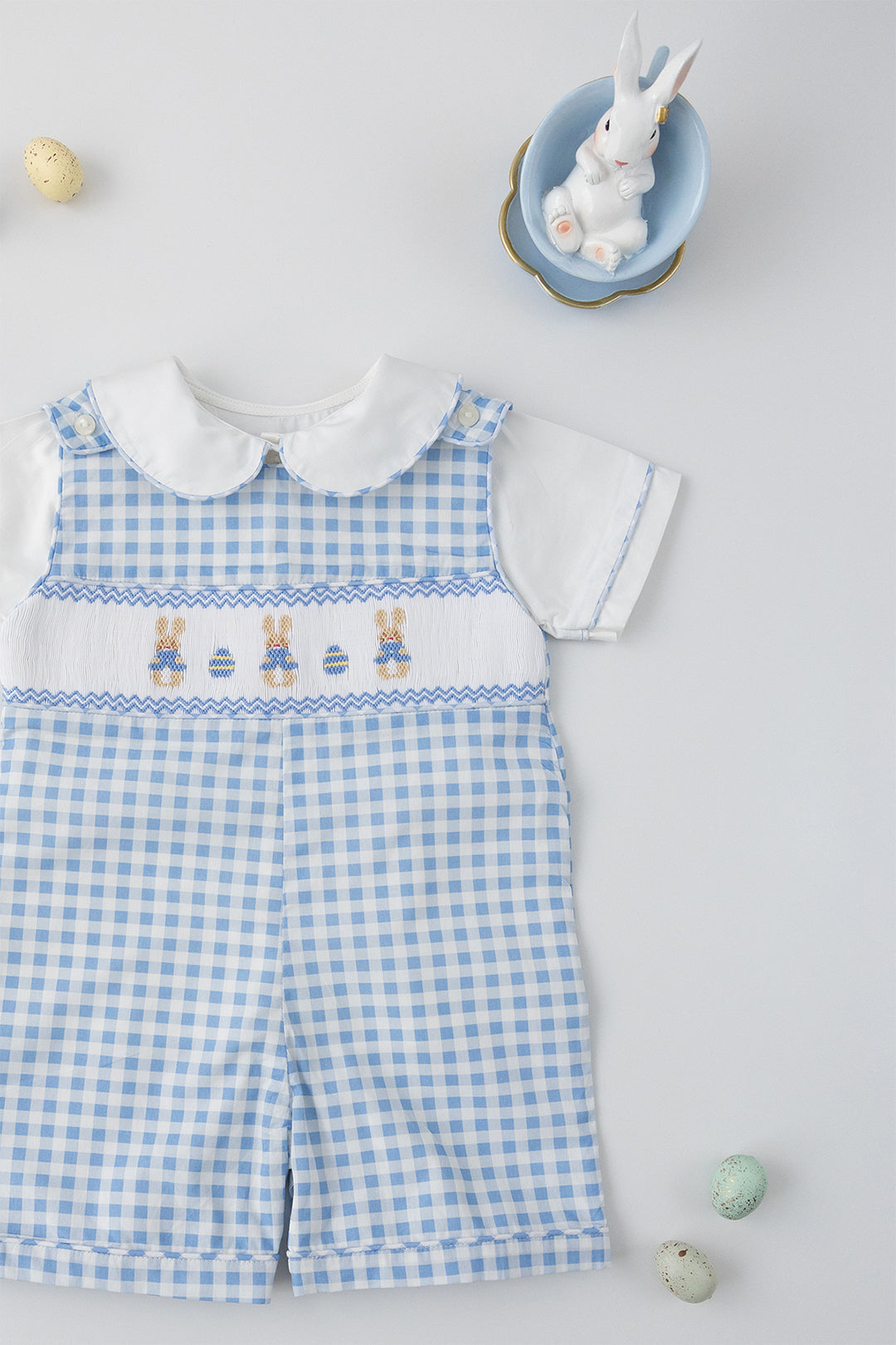 This timeless Jon Jon features three handsmocked bunnies across the bodice, beautifully complemented by two delicately smocked Easter eggs for touch of seasonal charm. Each detail is carefully stitched, creating a design that feels playful.