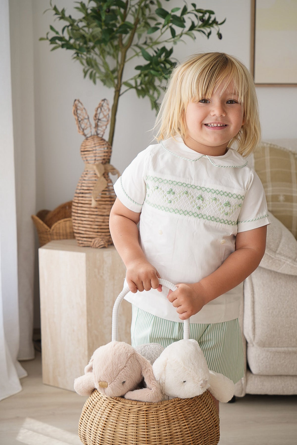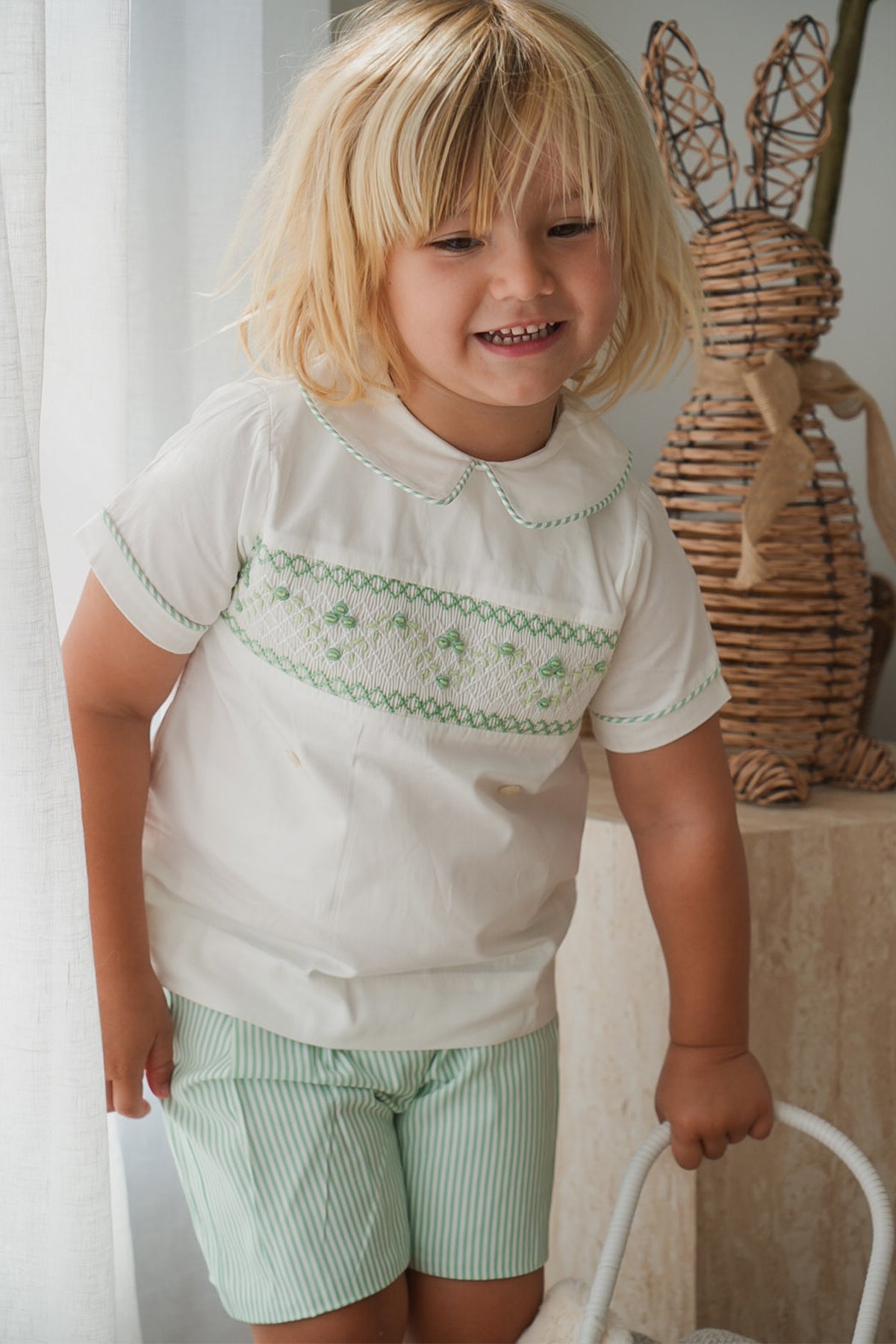 The Green Stripe Boys Set features a classic white shirt with delicate green handsmocked details and coordinating green stripe piping, paired with green stripe shorts. Crafted from 100% cotton and fully lined for comfort, this set offers effortless style for Easter celebrations, special occasions, or everyday wear.